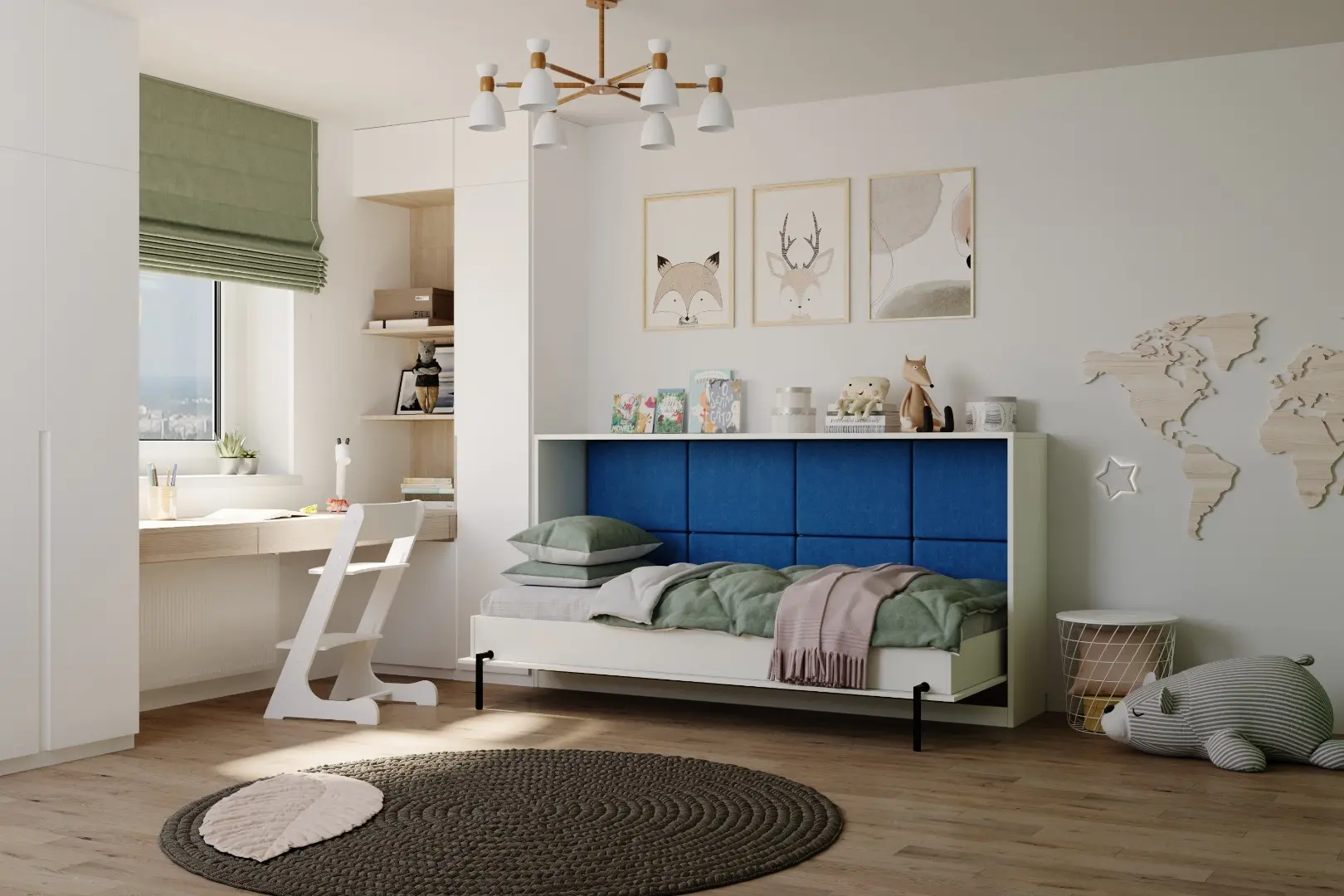 Детская горизонтальная шкаф-кровать "Little sleeper".  Работает на механизме раскладывания собственной разработки "Start". Кровать раскладывается легким движением руки, превращаясь в полноценное спальное место. Просто потяните ее за ручки, расположенные на фасаде и выставите ножки-опоры.