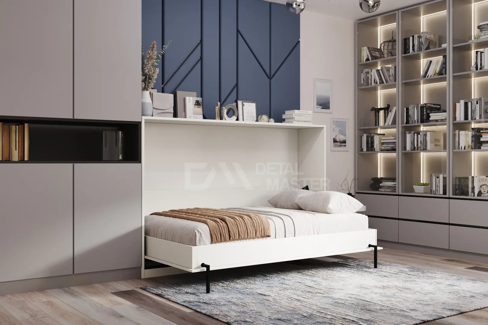 Горизонтальная шкаф-кровать "Solo Start".  Работает на механизме раскладывания собственной разработки "Start". Кровать раскладывается легким движением руки, превращаясь в полноценное спальное место. Просто потяните ее за ручки, расположенные на фасаде и выставите ножки-опоры.